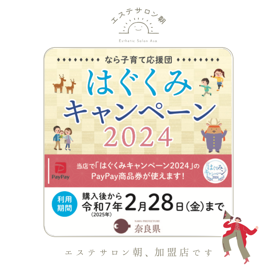 奈良市、朝活、夜活、朝エステ、夜エステ、フェイシャル、光フェイシャル、小顔、リフトアップ、ボディトリートメント、アロマ、痩身、ダイエット、キャビテーション、ラジオ波、脱毛、ヘッドマッサージ、ヘッドスパ、スキンケア、たるみ、しみ、しわ、毛穴、二の腕、ぽっこりお腹、日焼け、日焼け対策、美白、美肌、肩こり、むくみ、むくみ解消、はぐくみキャンペーン2024、奈良県はぐくみキャンペーン2024